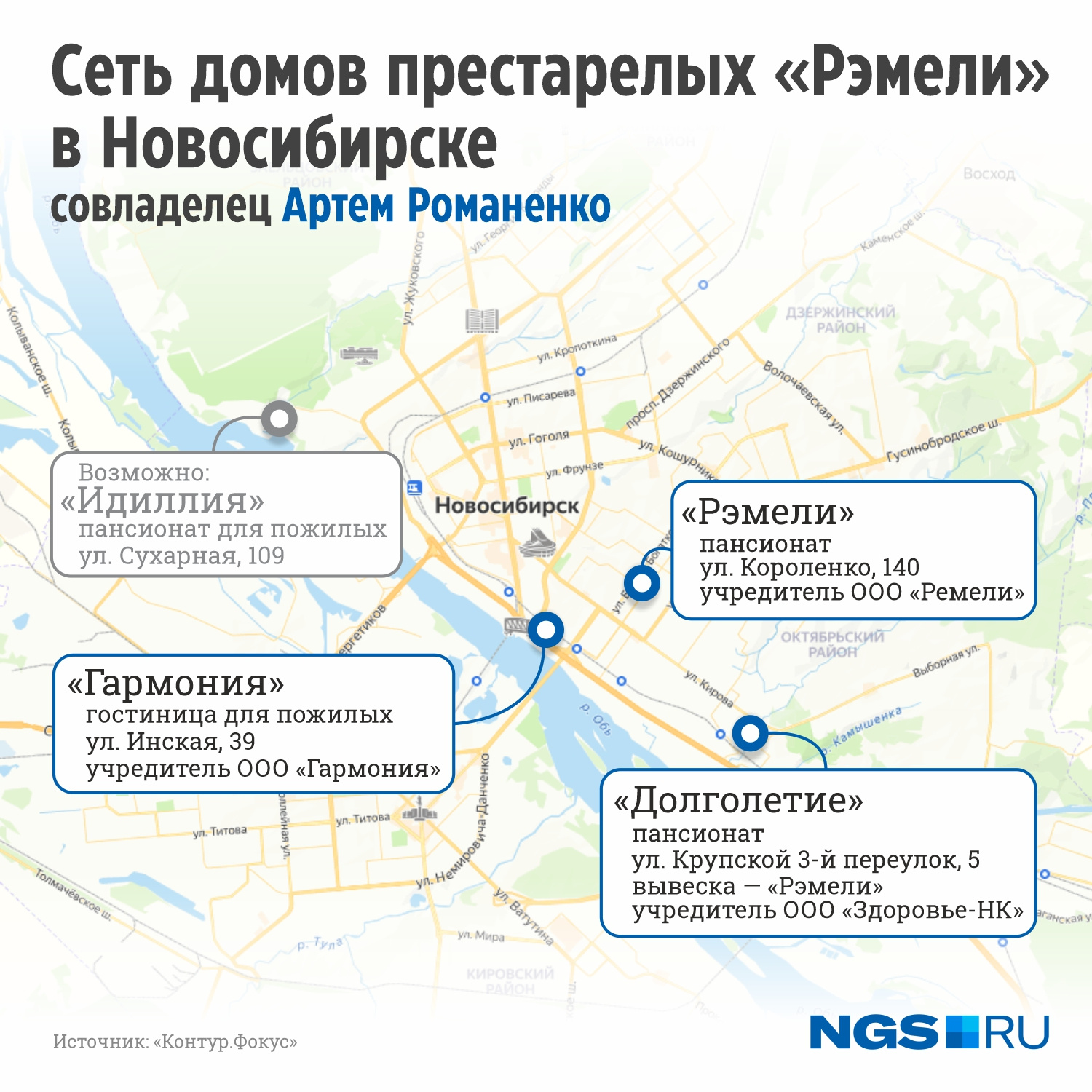 Сейчас с сетью «Рэмели» в Новосибирске связаны минимум три дома престарелых. При этом все они по факту существуют под разными юридическими лицами.