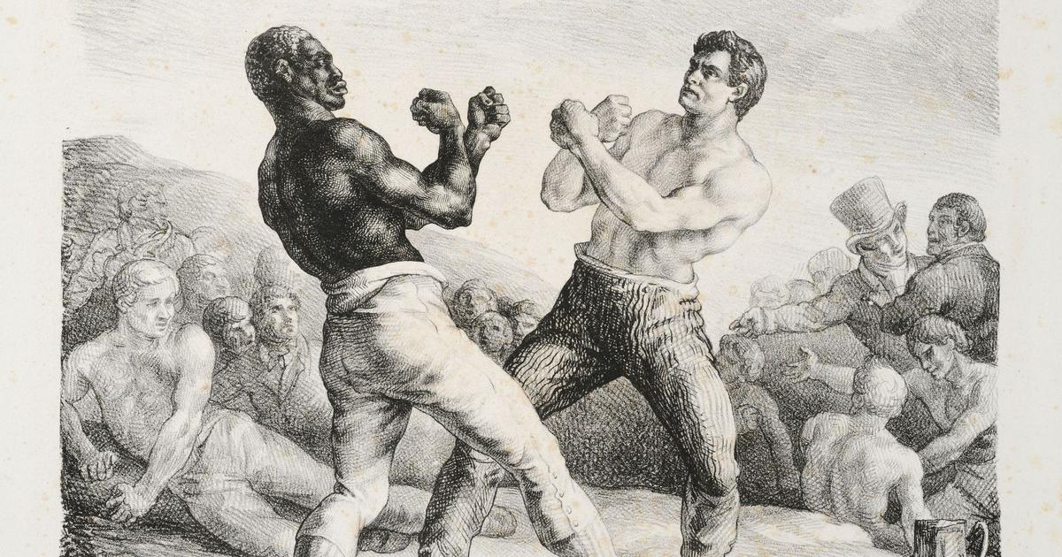 Dans cette lithographie réalisée en 1818 - le dessin sur dalle de calcaire étant alors un médium nouveau -, le romantique Théodore Géricault s’intéresse à la boxe. Le sport, dérivé plus normé et moins violent que le pugilat antique, est également d’invention récente. Il a commencé d’être codifié dans la première moitié du XVIIIe siècle en Angleterre et ne séduit que progressivement le continent. La France voit en effet plus volontiers la savate (pratiquée depuis le XVIIe) comme le «noble art» ; les deux pratiques véhiculant pourtant les mêmes valeurs aristocratiques de courage, d’honneur et de sens stratégique avec attaques, esquives, défenses et gestion de l’effort.