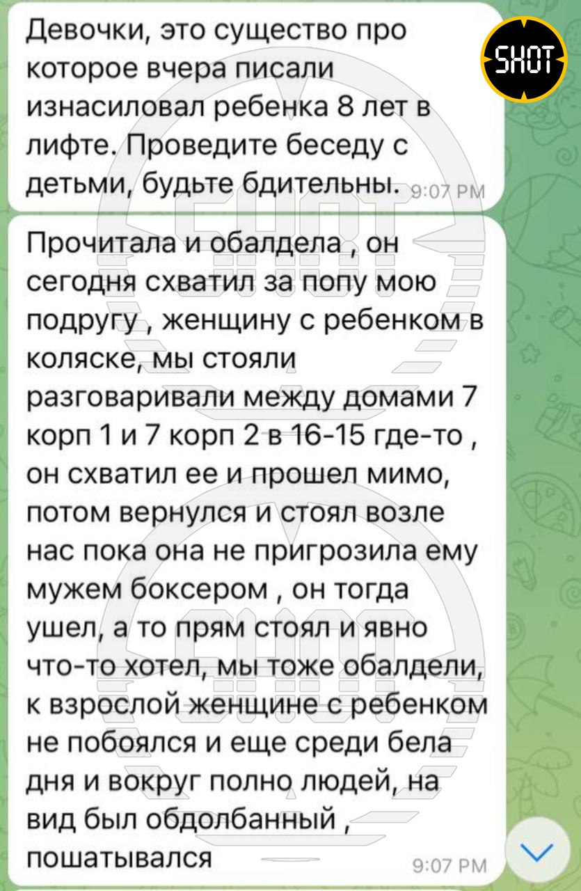 Поймать извращенца смогли благодаря соседскому чатику дома на улице Липовый парк. Сначала одна из шокированных мам рассказала, что в четверг днём незнакомый мужчина приставал к её 9-летней дочери в лифте, когда та возвращалась с прогулки с собакой. Школьница начала кричать, мужчина испугался и убежал. Потом другая мать пожаловалась, что неадекват приставал и к её 8-летней дочери.