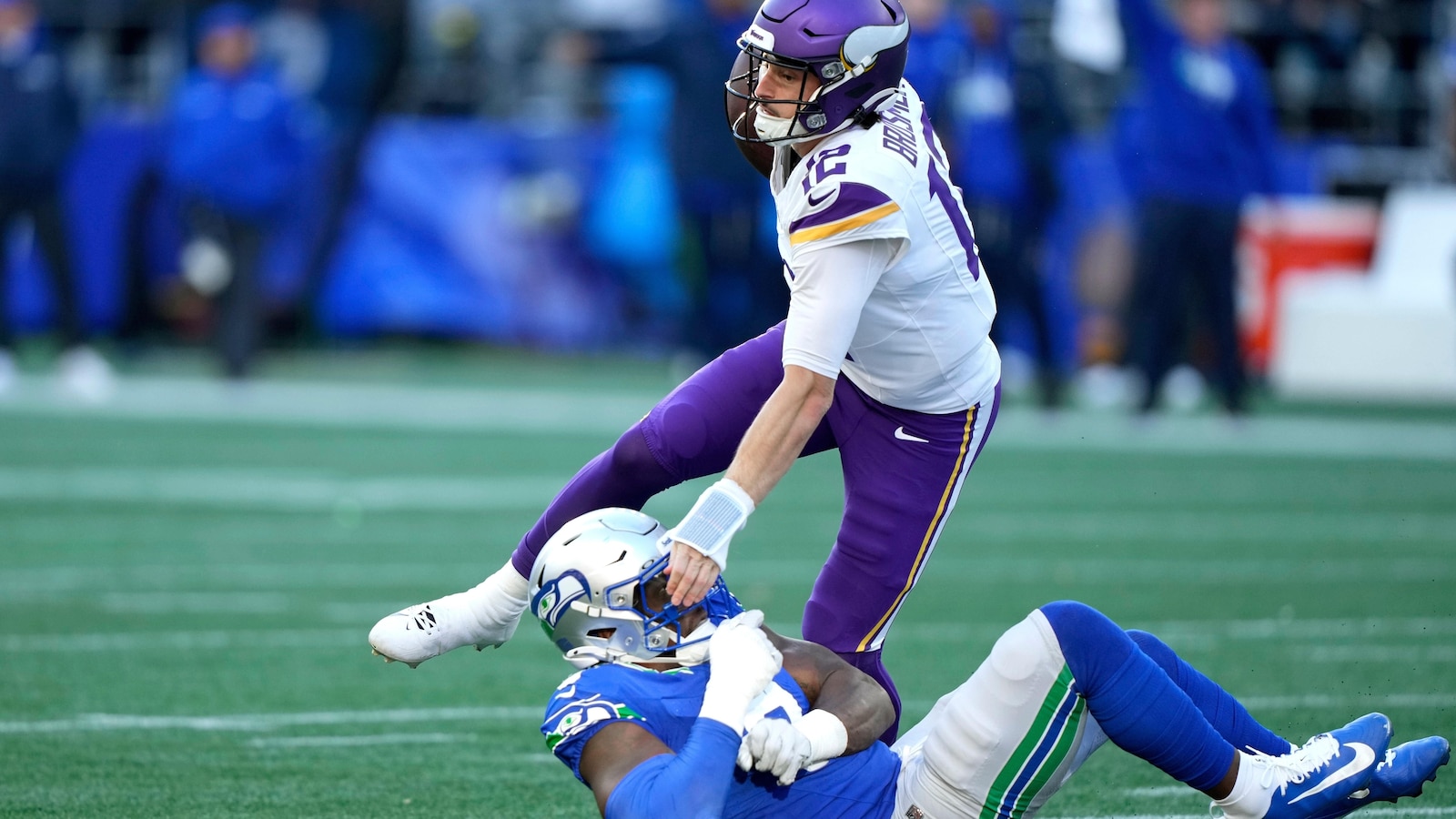 The rookie making his first career start was swarmed by Seattle defensive end DeMarcus Lawrence, who had barreled into the backfield unblocked on this fourth-and-1 play from the 4-yard line and chased Brosmer all the way back to the 24 with the Seahawks leading by just a field goal late in the second quarter on Sunday.