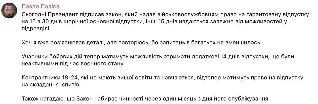 Президент Украины Владимир Зеленский подписал закон, гарантирующий военнослужащим право на ежегодный отпуск. Согласно документу, военные получат 15 гарантированных дней отдыха из 30 положенных. Остальные 15 дней будут предоставляться в зависимости от оперативной обстановки в подразделении.