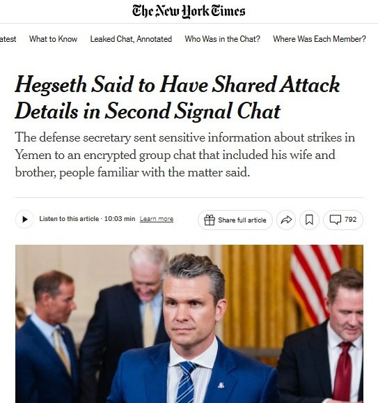 Также в чате состояли брат министра, его адвокат и ещё несколько человек, сообщает New York Times со ссылкой на источники.