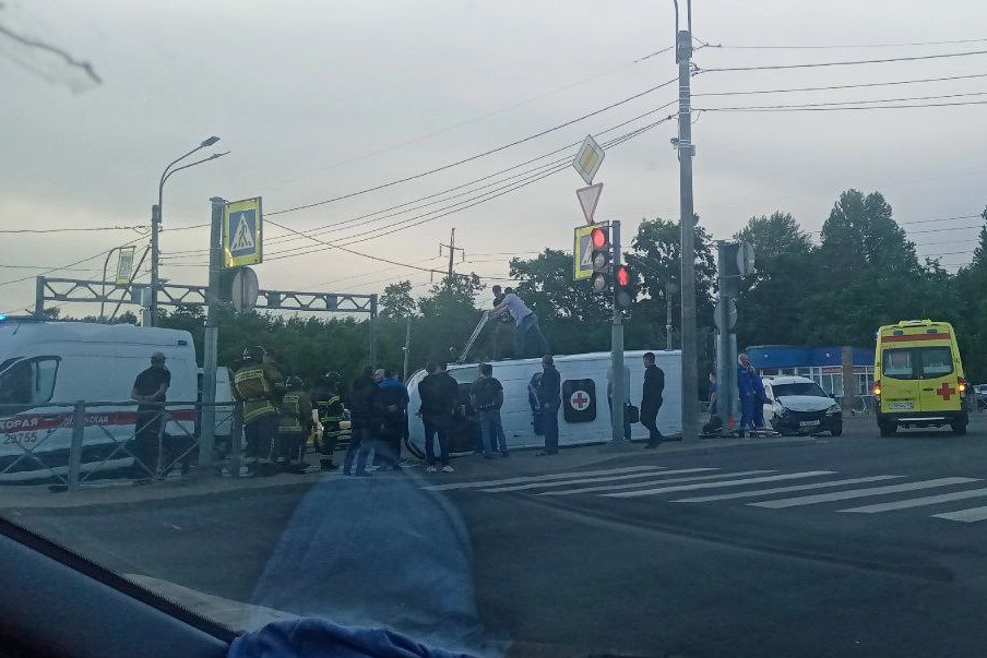 Машина скорой помощи оказалась на боку после столкновения с легковушкой на пересечении Софийской улицы и Дунайского проспекта. Инцидент произошел вечером 14 июня.
