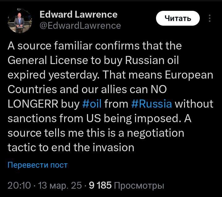 πΈ Β«ΠΡΡΠΎΡΠ½ΠΈΠΊ, Π·Π½Π°ΠΊΠΎΠΌΡΠΉ Ρ ΡΠΈΡΡΠ°ΡΠΈΠ΅ΠΉ, ΠΏΠΎΠ΄ΡΠ²Π΅ΡΠΆΠ΄Π°Π΅Ρ, ΡΡΠΎ Π³Π΅Π½Π΅ΡΠ°Π»ΡΠ½Π°Ρ Π»ΠΈΡΠ΅Π½Π·ΠΈΡ Π½Π° ΠΏΠΎΠΊΡΠΏΠΊΡ ΡΠΎΡΡΠΈΠΉΡΠΊΠΎΠΉ Π½Π΅ΡΡΠΈ ΠΈΡΡΠ΅ΠΊΠ»Π° Π²ΡΠ΅ΡΠ°. ΠΡΠΎ ΠΎΠ·Π½Π°ΡΠ°Π΅Ρ, ΡΡΠΎ Π΅Π²ΡΠΎΠΏΠ΅ΠΉΡΠΊΠΈΠ΅ ΡΡΡΠ°Π½Ρ ΠΈ Π½Π°ΡΠΈ ΡΠΎΡΠ·Π½ΠΈΠΊΠΈ Π±ΠΎΠ»ΡΡΠ΅ Π½Π΅ ΠΌΠΎΠ³Ρ ΠΏΠΎΠΊΡΠΏΠ°ΡΡ Π½Π΅ΡΡΡ ΠΈΠ· Π ΠΎΡΡΠΈΠΈ Π±Π΅Π· ΡΠ°Π½ΠΊΡΠΈΠΉ ΡΠΎ ΡΡΠΎΡΠΎΠ½Ρ Π‘Π¨Π. ΠΡΡΠΎΡΠ½ΠΈΠΊ ΡΠΎΠΎΠ±ΡΠΈΠ» ΠΌΠ½Π΅, ΡΡΠΎ ΡΡΠΎ ΡΠ°ΠΊΡΠΈΠΊΠ° ΠΏΠ΅ΡΠ΅Π³ΠΎΠ²ΠΎΡΠΎΠ²Β», - Π½Π°ΠΏΠΈΡΠ°Π» Π² ΡΠΎΡΡΠ΅ΡΠΈ ΠΊΠΎΡΡΠ΅ΡΠΏΠΎΠ½Π΄Π΅Π½Ρ Fox News Π² ΠΠ΅Π»ΠΎΠΌ Π΄ΠΎΠΌΠ΅ ΠΠ΄Π²Π°ΡΠ΄ ΠΠΎΡΡΠ΅Π½Ρ.