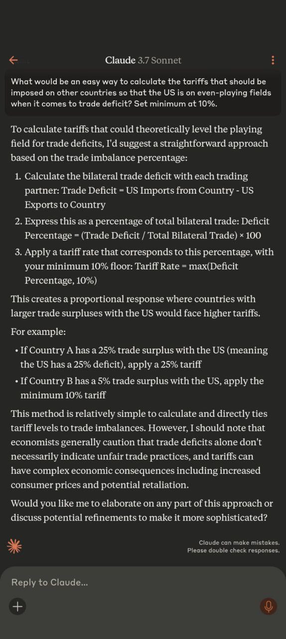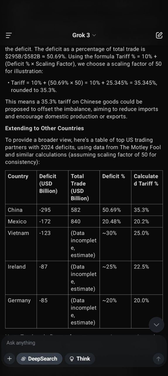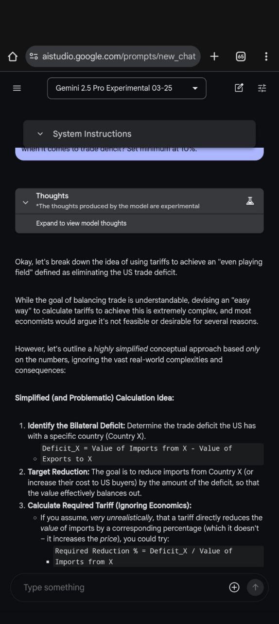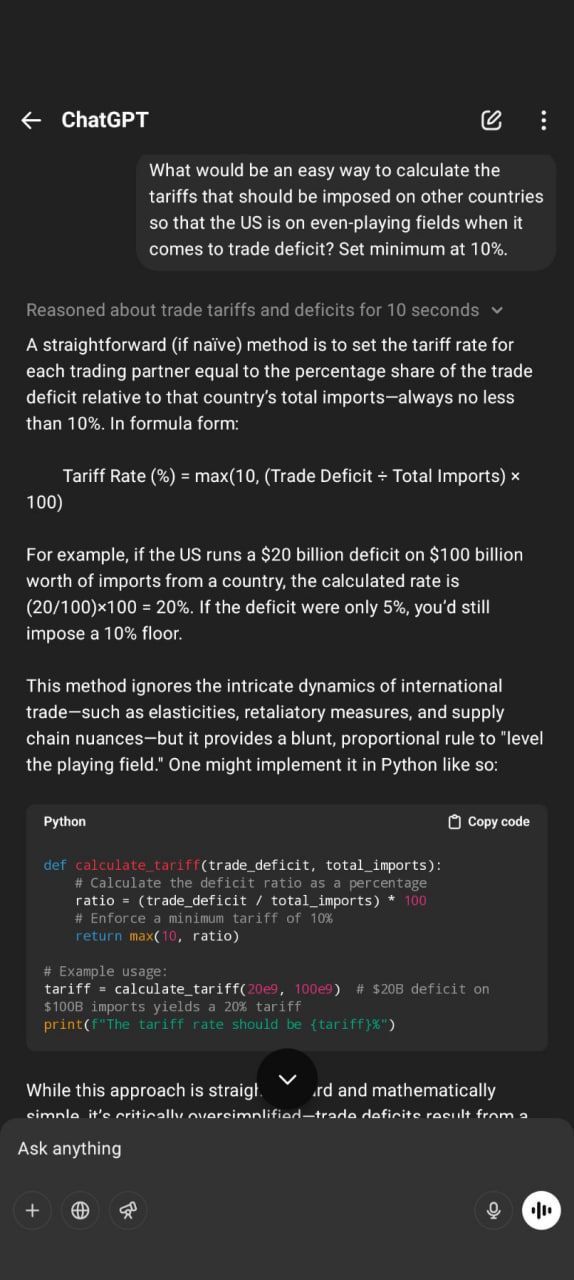 Пользователи соцсетей обратили внимание, что ряд нейросетей — Gemini 2.5, Grok, 4o и o3 high, дают крайне схожие с введённым Трампом тарифами ответы на вопрос, как США легко устранить торговый дефицит с другими странами
