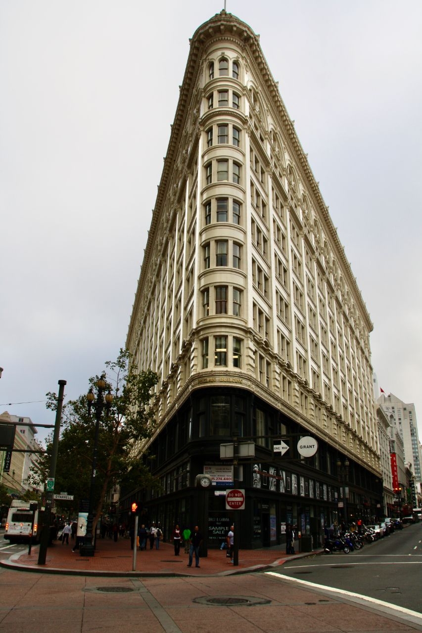 Возможно оно мне запомнилось как и его знаменитый побратим с Манхеттена на пересечении 5-й Авеню и Мэдисон Авеню. На самом деле таких зданий несколько как в Нью-Йорке, так и в Сан-Франциско. А дело в том, что и там и там есть улица, которая режет остальные, расположенные в шахматном порядке, под острым углом градусов в 30 не больше. Только в Нью-Йорке это Бродвей, а в сан-Франциско — это Маркет Стрит.