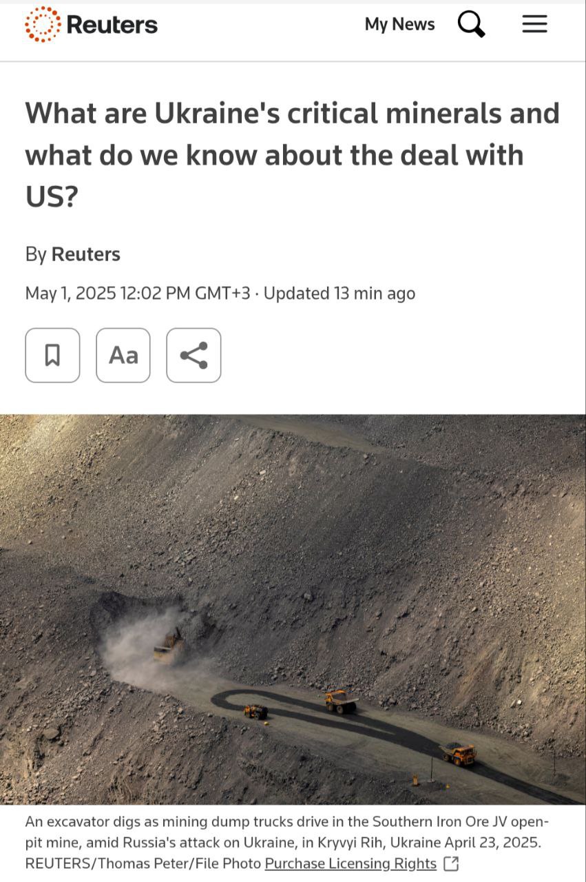 Reuters провёл анализ стратегически важных минералов, включая редкоземельные элементы и другие природные ресурсы, которые есть на Украине, и выяснил, что около 40% находятся под контролем России.