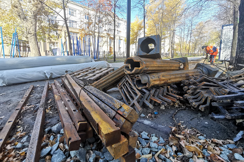 Параллельно восстанавливают историческое ограждение. О том, что Первомайскому скверу вернут первоначальный облик, ещё на старте благоустройства рассказывала заместитель мэра Анна Терешкова. Вдоль улицы Советской уже сделали бетонное основание. Работы продолжаются со стороны Максима Горького. В сквер завозят элементы из чугуна. Новые опоры, перила и декоративные фрагменты забора пока лежат у строительных бытовок.