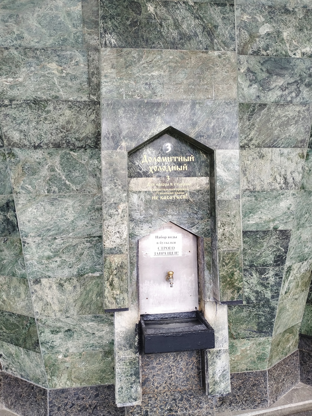 Вот он из самых глубоких скважин. И поэтому наполнен всякими сульфатами, магнием и даже железом буквально до отвала. И это самая лечебная минералочка из всех видов нарзана. Поэтому, как это почти всегда бывает, в комплекте с полезностью идёт специфический вкус и запах . Нарзан можно и нужно БЕСПЛАТНО набирать в бюветах и галереях Кисловодска.