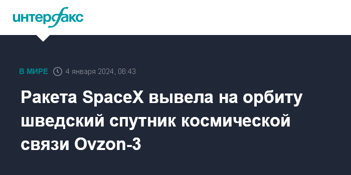 Москва. 4 января. INTERFAX.RU - Ракета Falcon 9 в четверг по московскому времени успешно вывела на орбиту шведский спутник широкополосной связи Ovzon-3, сообщила компания-разработчик носителя SpaceX.