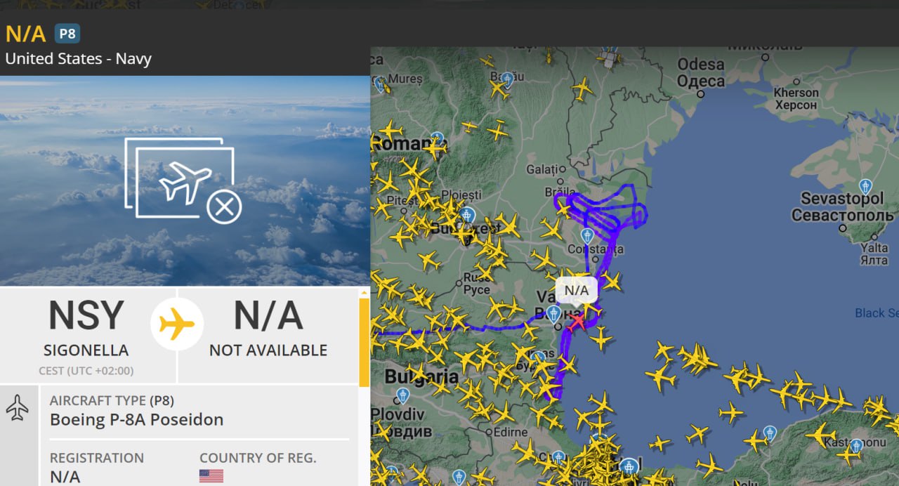 Американский противолодочный Boeing P-8A Poseidon уже несколько часов интенсивно патрулирует побережье Болгарии и Румынии.