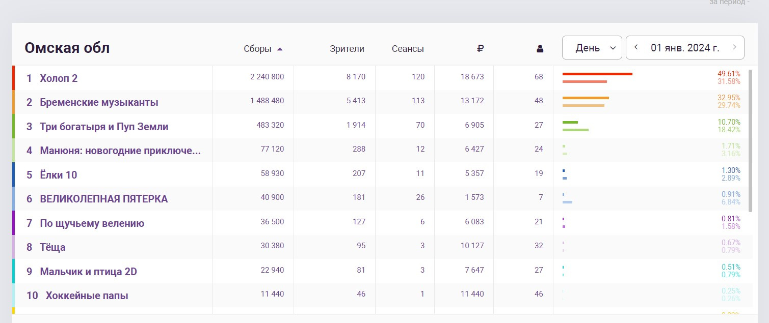 Сегодня, 1 января, за неполный день омичи потратили в кино 4 миллиона рублей. Статистика появилась на сайте Единой информационной системы сведений о показах фильмов в кинозалах. Так, самый кассовый фильм по области — «Холоп 2» (12+), он к моменту публикации собрал больше двух миллионов рублей. На втором месте — «Бременские музыканты» (6+), это около 1,5 миллионов рублей. Кстати, эти фильмы вышли сегодня.