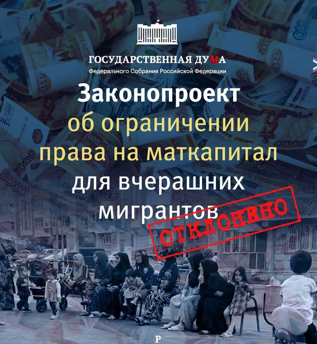 Госдума отклонила предложение ограничить право на материнский капитал для недавно получивших гражданство мигрантов. Таким образом, вчерашний мигрант из Средней Азии, только что получивший российский паспорт, независимо от его лояльности, знания русского языка и уважения к русской культуре, немедленно уравнивается в правах с коренными жителями страны.