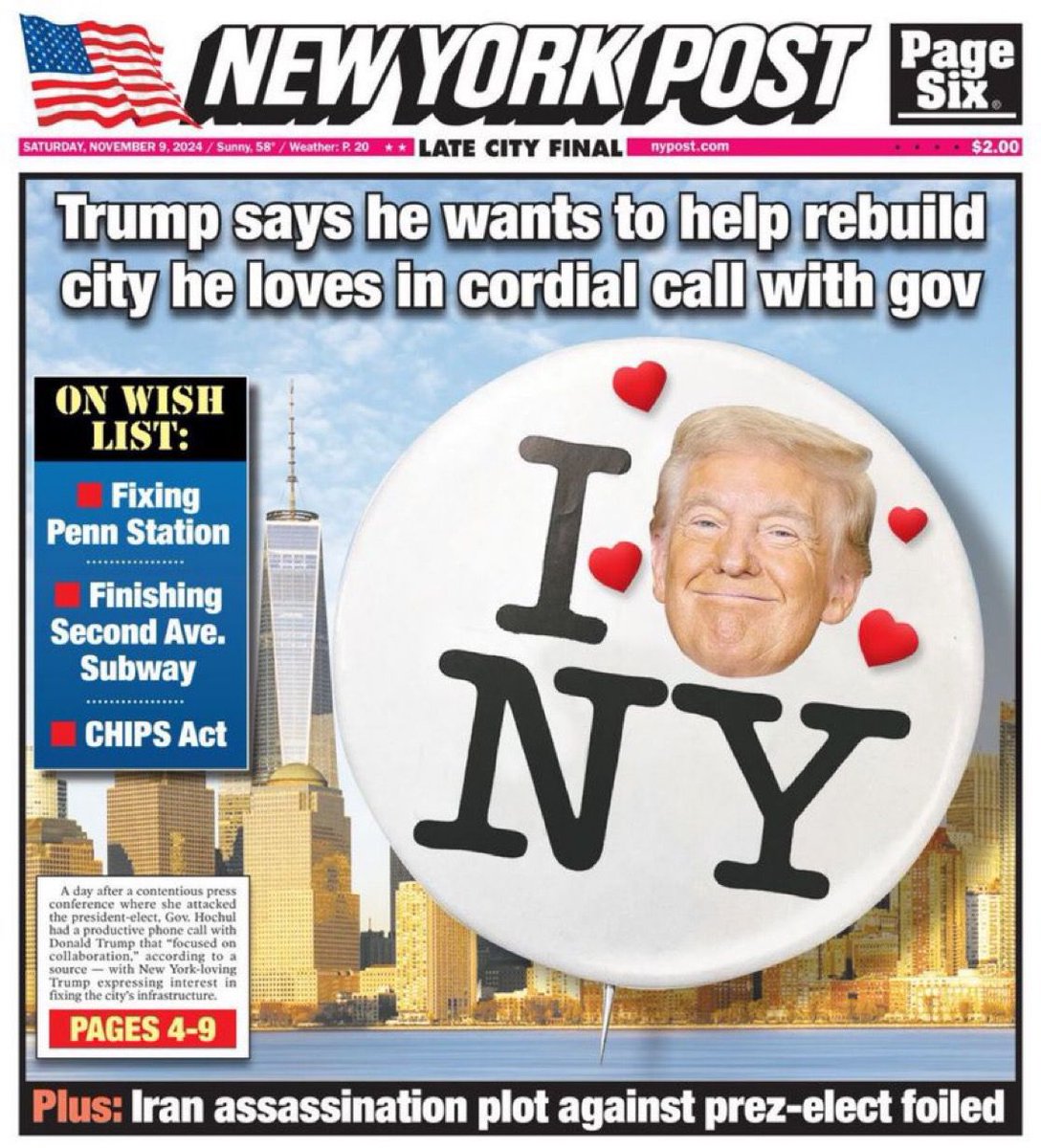 Правда, любовь оказалась «с интересом»: издание также разместило на передовице список пожеланий для Трампа в Нью-Йорке: реконструкция вокзала, завершение строительства Второй авеню, закон о чипах.