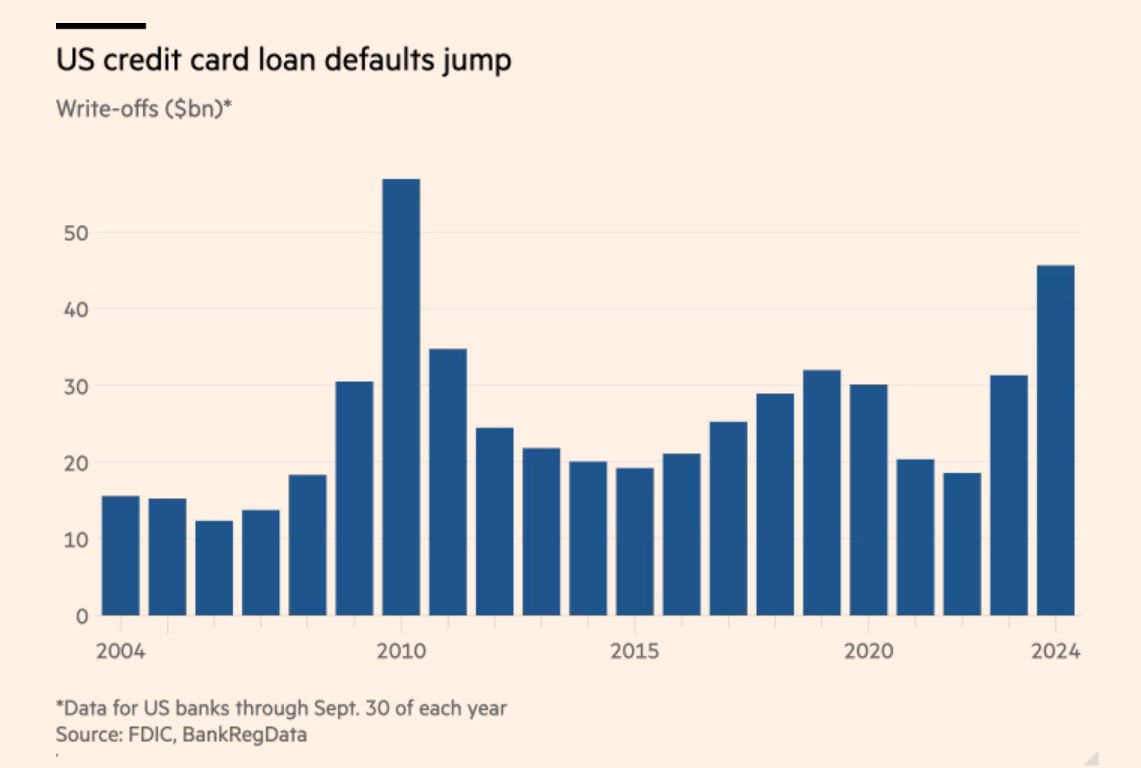 Количество невозвратов по кредитным картам в США достигло максимального уровня с 2010 года. За первые девять месяцев 2024 года кредиторы списали $46 млрд. остатков по кредитам с серьезными просрочками, что на 50 % больше, чем за тот же период годом ранее, и является самым высоким показателем за последние 14 лет. Потребители «выдохлись» после нескольких лет высокой инфляции, а сбережения времен пандемии испарились, отмечает FT. @banksta