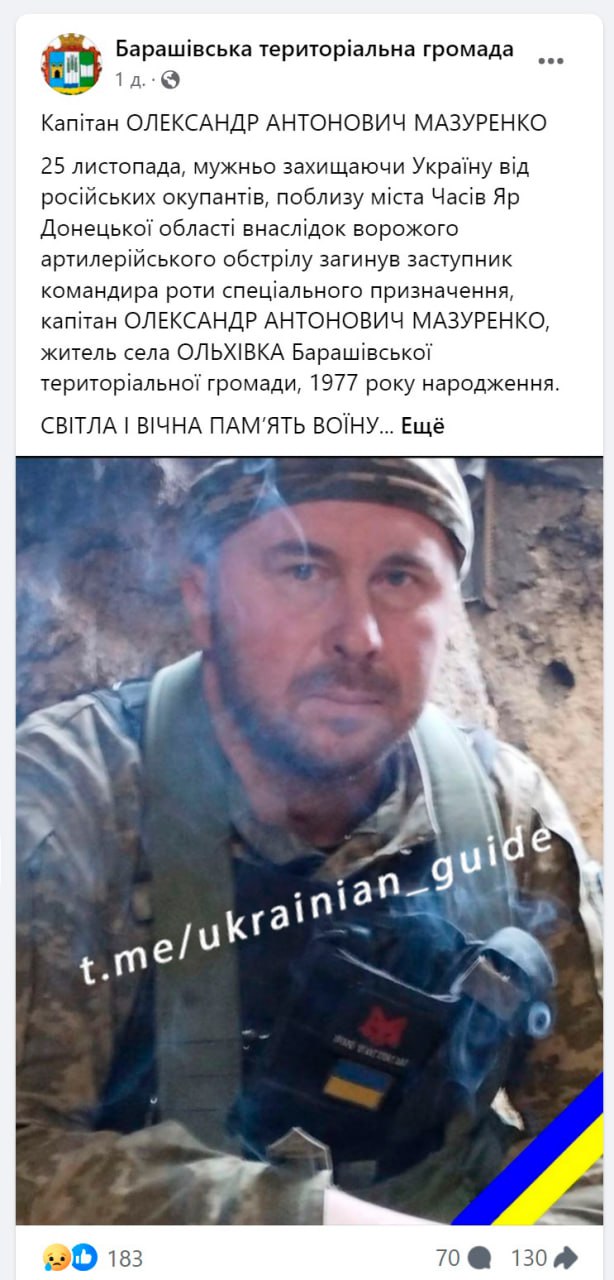 попал под артиллерийский обстрел. Ликвидирован в районе города Часов Яр несколько дней назад.