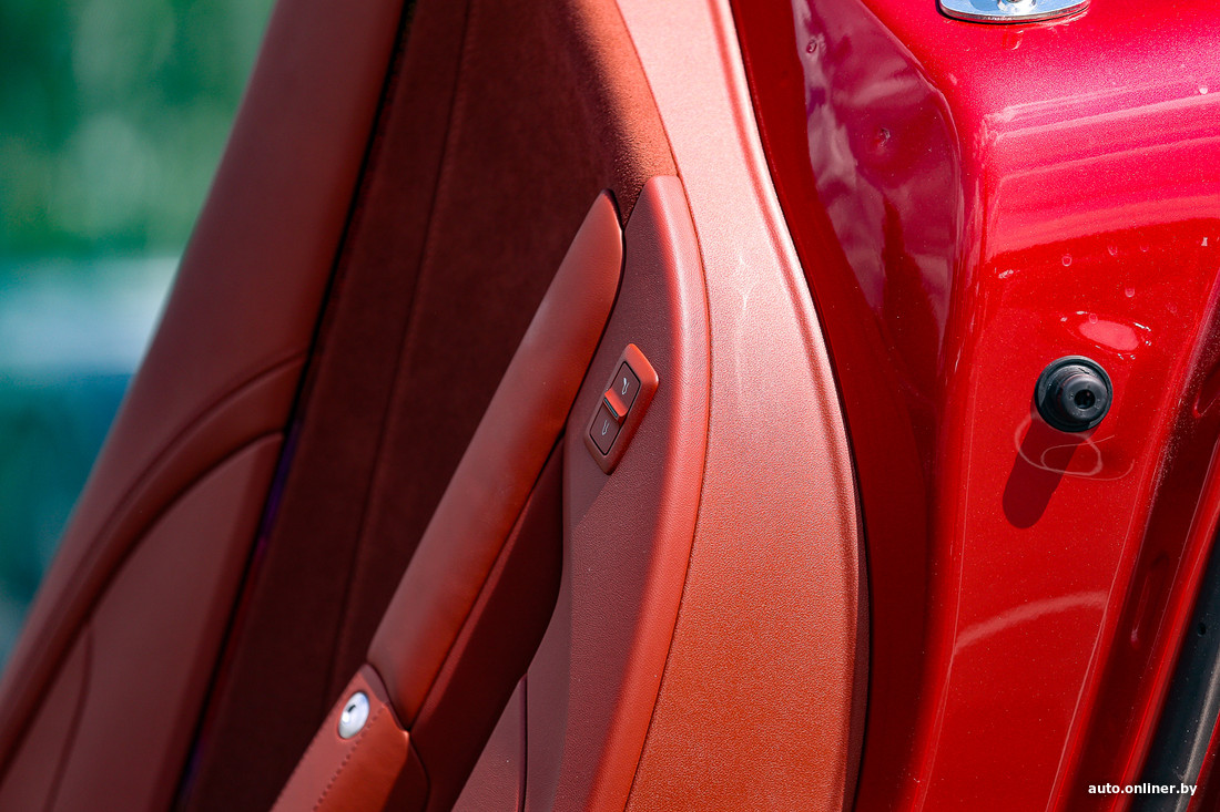 Да, представьте себе, в этом пижонском интерьере с красной кожей и алькантарой нашлось место для физических клавиш. Однако вместо трех колодцев с приборами перед рулем установлены три экрана: на центральный выводится вся нужная водителю информация, левый отвечает за настройки автомобиля, а правый — за мультимедийные возможности. И, разумеется, оба боковых дисплея хорошо так перекрываются баранкой…