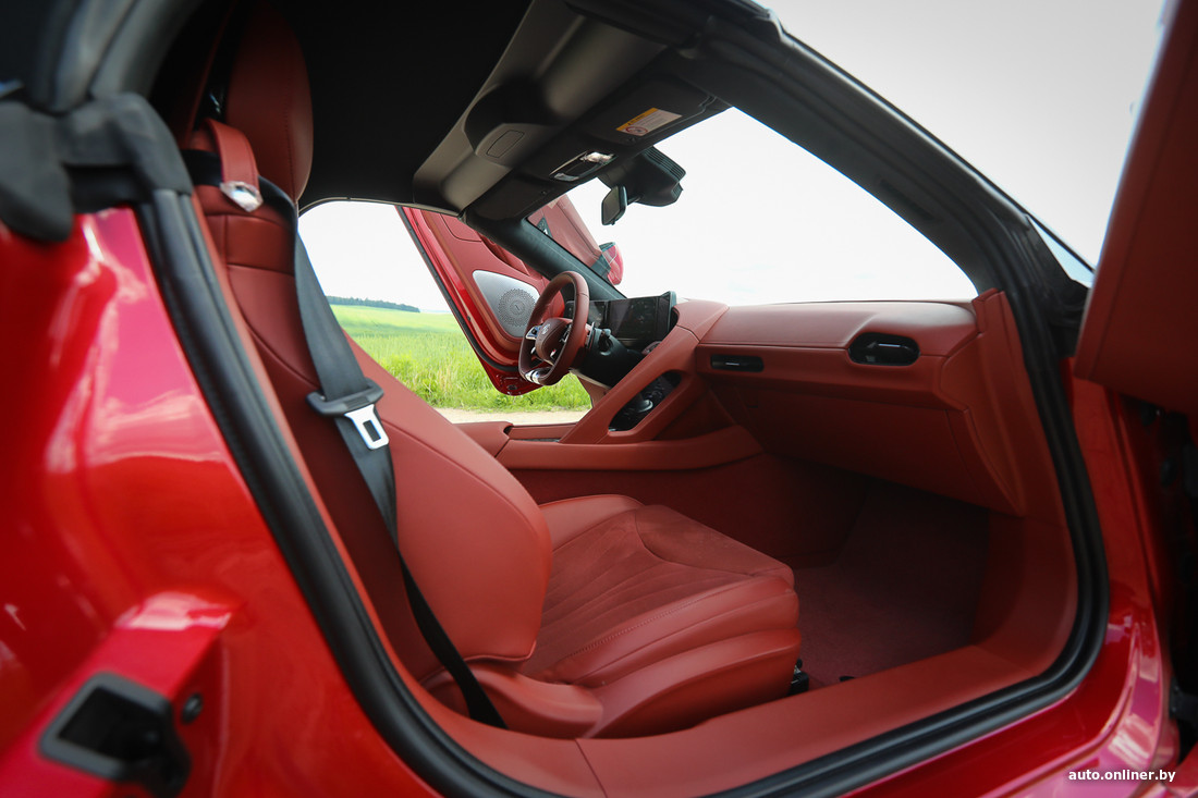 В полном соответствии с законами жанра двухместный салон плотно облегает водителя и пассажира. Кресла имеют хорошо развитую боковую поддержку, но профиль подушки невыразительный, по углу ее не отрегулируешь. А самое главное — даже в самом низком положении посадка получается высокой. Эй, мы в родстере или где?