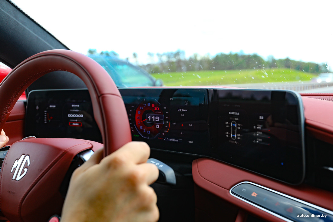 Так вот, ехать «по-взрослому» Cyberster старается, но ему приходится туго. Да, у него потрясающая динамика (штатный хронометр, работающий в режиме SuperSport, показал аж 2,99 секунды до сотни в одной из попыток — при заявленных 3,2 секунды), громкий «вруууум» из динамиков и даже хваткие тормоза, которые, похоже, довольно выносливые для такой приличной массы.