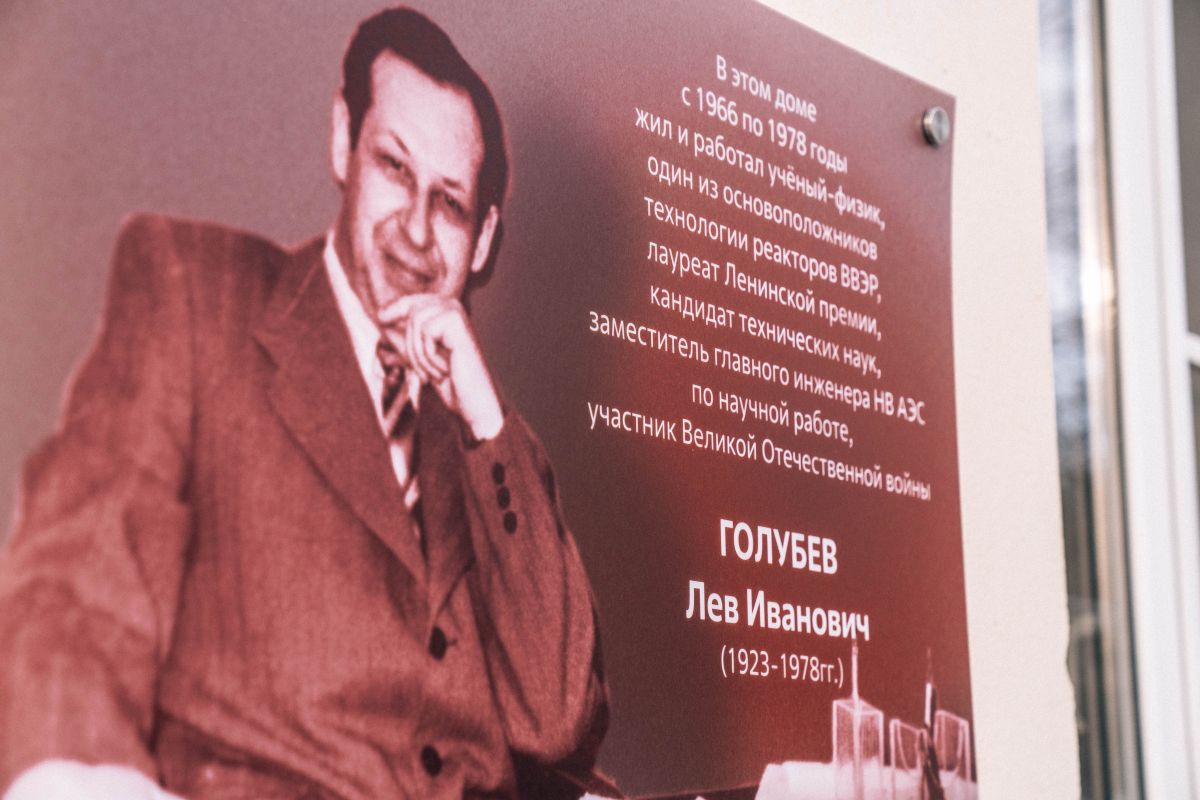 В Нововоронеже увековечили память одного из основоположников технологии реакторов ВВЭР, лауреата Ленинской премии, кандидата технических наук, заместителя главного инженера Нововоронежской АЭС по научной работе, участника Великой Отечественной войны Льва Ивановича Голубева. На доме, где учёный-физик жил с 1966 по 1978 год, появилась памятная доска. 17 ноября атомщики отметили столетний юбилей Льва Голубева, продолжателя традиций научной школы Игоря Курчатова. На открытие пришли родные и близкие, представители атомной станции, коллеги, молодые специалисты и студенты.