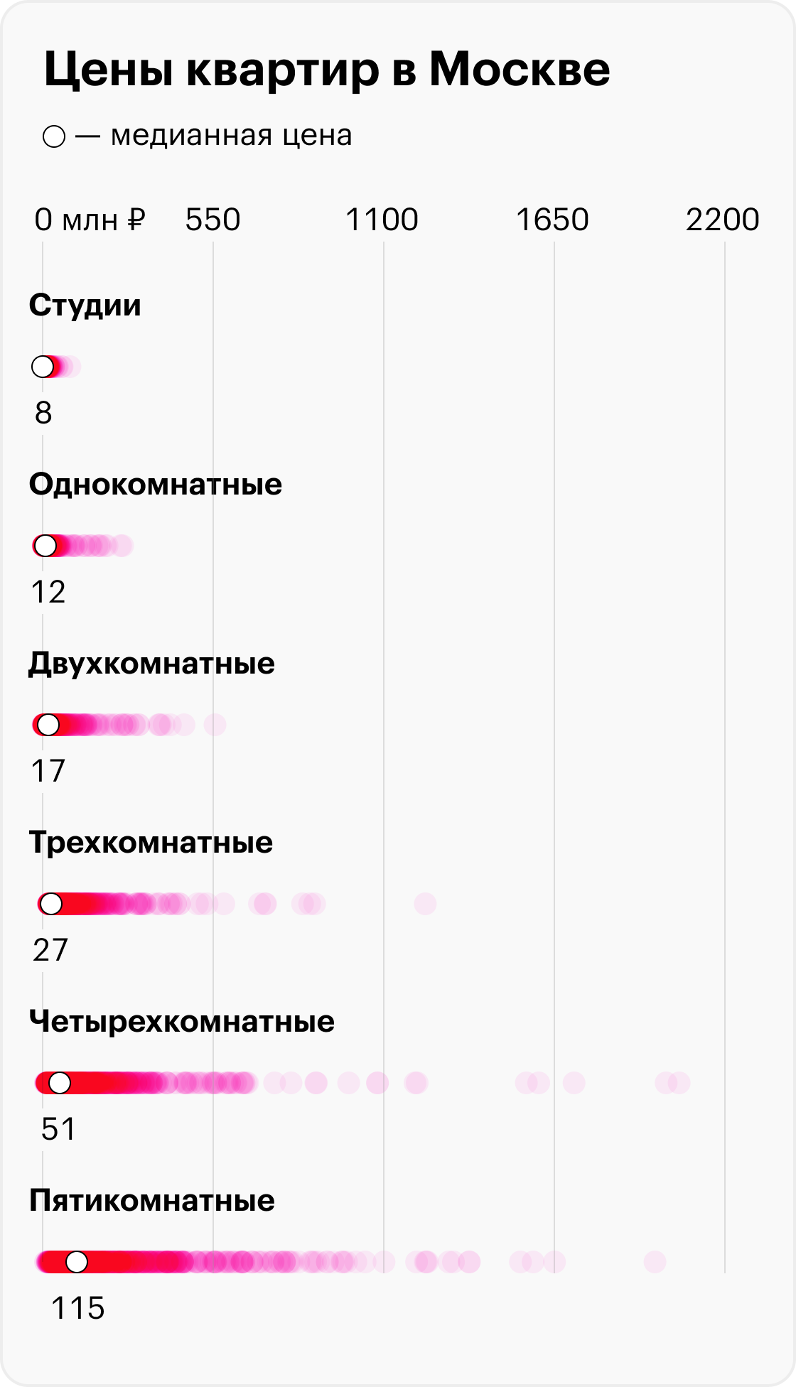 Например, встречаются квартиры за миллиард рублей и даже дороже. Это искажает среднее значение, так что лучше смотреть на медиану. Неудивительно, что на столичном рынке жилья есть эффект Билла Гейтса. В отличие от площади цена квартиры ограничена только фантазией продавца.