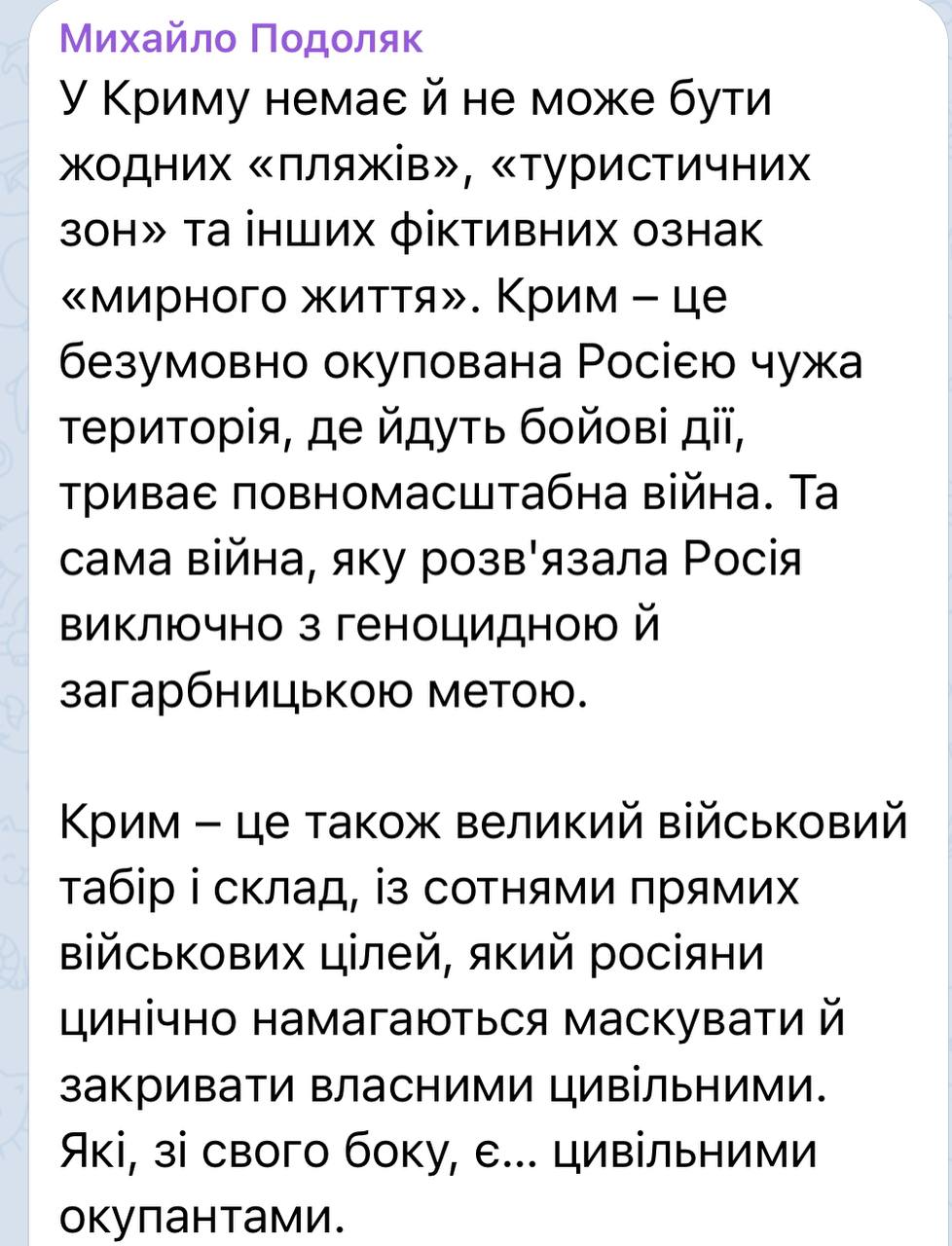 Советник главы офиса Зеленского Михаил Подоляк объявил всех крымчан и гостей полуострова законными целями для ВСУ.
