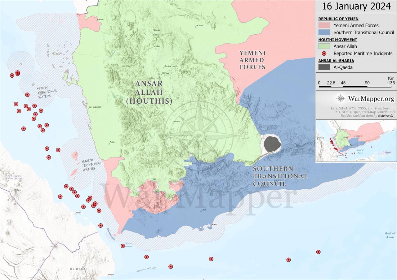 Карта атак хуситов на коммерческое судоходство у побережья Йемена.