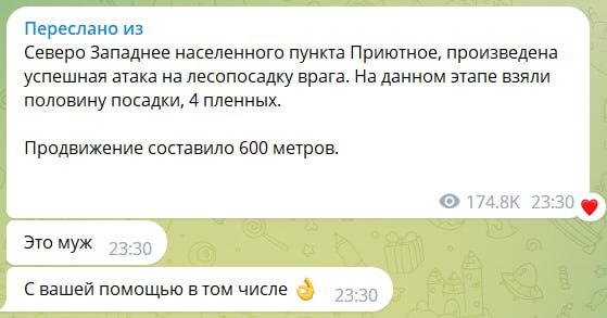 "Северо-западнее населённого пункта Приютное произведена успешная атака на лесопосадку врага. На данном участке взяли половину посадки, 4 пленных