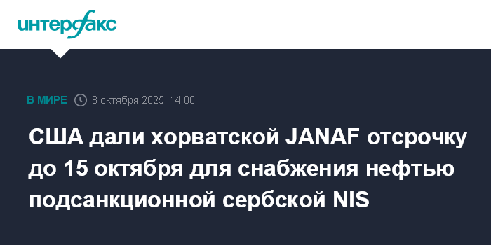 Москва. 8 октября. INTERFAX.RU - Власти США дали возможность хорватской компании JANAF продолжить деятельность в обычном режиме до 15 октября 2025 года. Трубопровод этой компании, в частности, обеспечивает сербскую компанию NIS, которая попала в санкционный список США.
