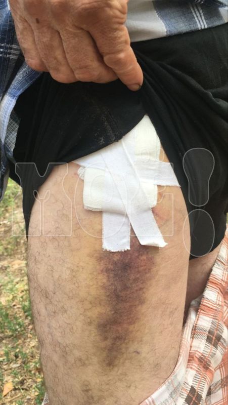 — В среду, 7 августа, я отправился пешком на работу в сторону остановки «Серафимовича», вышел пораньше, думал, где-то за час дойду. Когда проходил мимо ДК Кирова, вдалеке услышал хлопок, как я потом понял, в Берёзовой роще, и буквально через несколько минут, когда я был между ДК Кирова и остановкой «Гипрокаучук», совсем рядом, метрах в 40 — 50 от меня раздался новый взрыв, посыпались стёкла. Думаю, надо быстрее отсюда двигать. Почувствовал боль в бедре, но всё равно собирался идти на работу, прошёл метров двадцать и понял — не дойду. Глянул на руку— рука вся в крови и по спине что-то течёт, под лопаткой какое-то неудобство. Кое-как доковылял до остановки «Ул. Полины Осипенко», свернул на Ленинградскую и зашёл в травмпункт, первую помощь мне оказали там — промыли и дезинфицировали раны и вызвали скорую, которая отвезла меня в областную больницу. Там сделали КТ и сразу — на операционный стол. Под местным наркозом вскрыли сначала спину под правой лопаткой, шарили-шарили там, врач сказал, что «глубоко, не достаём», и заштопали разрез. Потом лёг на бок — то же проделали с бедром, — врач сказал, «пошло вдоль кости, но ушло куда-то глубоко». То есть хирург не достаёт. Зашили и бедро. После КТ сообщили, что внутри меня не металл, а что-то другое. В пятницу, 10 августа, мне делали рентген, показавший, что во мне предметы круглой формы, может, шарики какие. В понедельник, 12 августа, у меня будет контрольный рентген, а во вторник обещают выписать домой. Говорят, ничего страшного, внутренние органы и артерии не задеты, и, если это не мешает, то можно жить и так. Чувствую себя вроде нормально, ну места разрезов ещё побаливают, полноги левой синие. Наверное, пройдёт скоро. Больничного у меня не будет, я официально не трудоустроен. Думаю отлежаться недельку — и на работу. У меня тяжело больная жена и два сына, так что помогать мне особо некому, да и жаловаться не на что. Врачи вроде сделали, что могли, а что не смогли — не сделали... — рассудил Владимир.