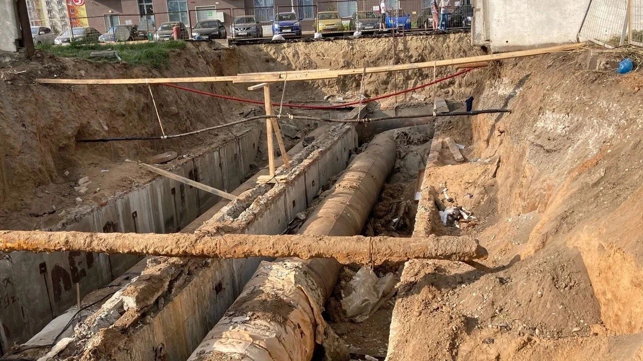 В декабре 2023 года там уже уходила земля после прорыва водопровода и канализационного коллектора. «ВКиЭХ» взяли за ремонт только в середине февраля 2024-го. К концу зимы размер котлована увеличился и заполнился горячей водой, которая вытекала на улицу.