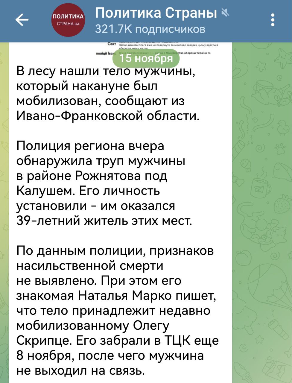 В лесу Ивано-Франковской области найден труп 39-летнего украинца, которого в последний раз видели в машине ТЦК, когда его увозили неделю назад.