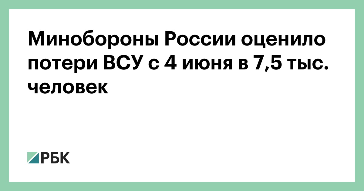 Вооруженные силы Украины с 4 июня потеряли около 7,5 тыс человек убитыми и ранеными, не считая погибших от применения российского высокоточного оружия. Об этом сообщило Минобороны России в телеграм-канале.