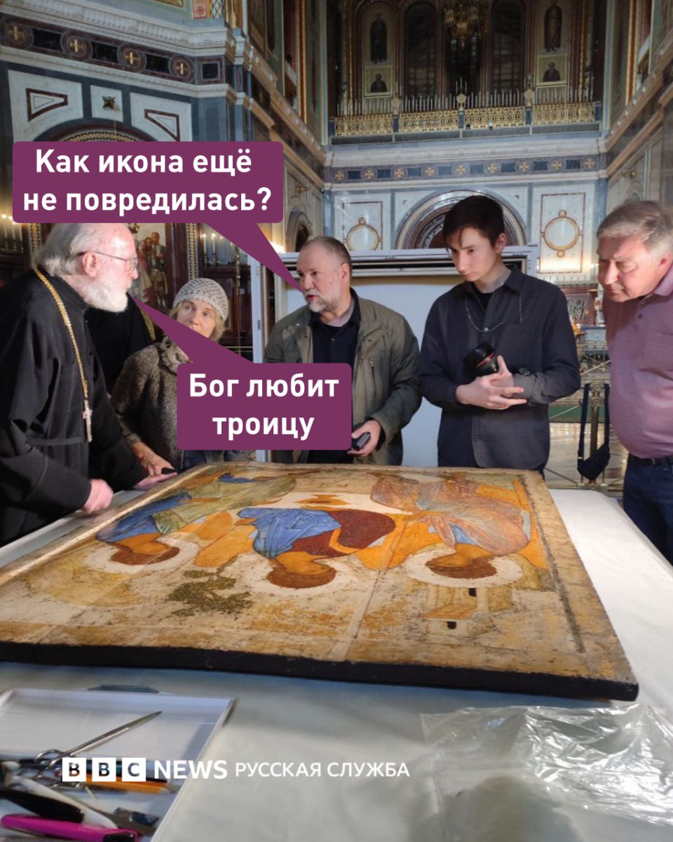 Икону «Троица» Андрея Рублева доставили к одноименному церковному празднику в Троице-Сергиеву лавру, где разместили в витрине без климат-контроля, сообщает «Русская служба Би-би-си».