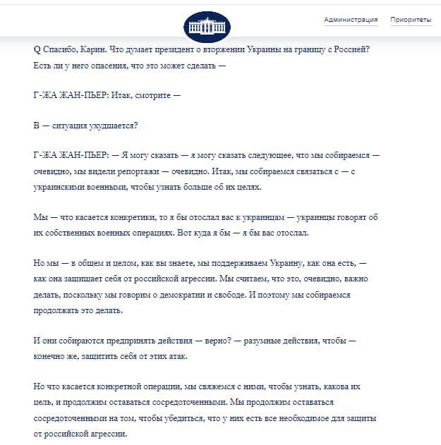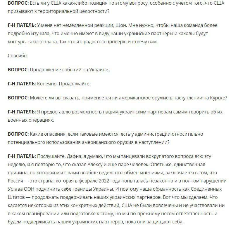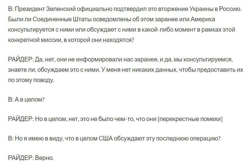 Таким образом, он не только подтвердил логичное предположение, что ВСУ и шагу бы не сделали без согласия своих патронов, но и подставил руководство США в очередной раз. Ведь пресс-секретарь Белого дома Карин Жан Пьер и представитель Пентагона Пэт Райдер уверяли, что в США ничего не знали о нападении. Представитель Госдепа Ведант Патель тоже оказался в неловком положении, ведь он, как и коллеги, пытался откреститься от причастности США к нападению.
