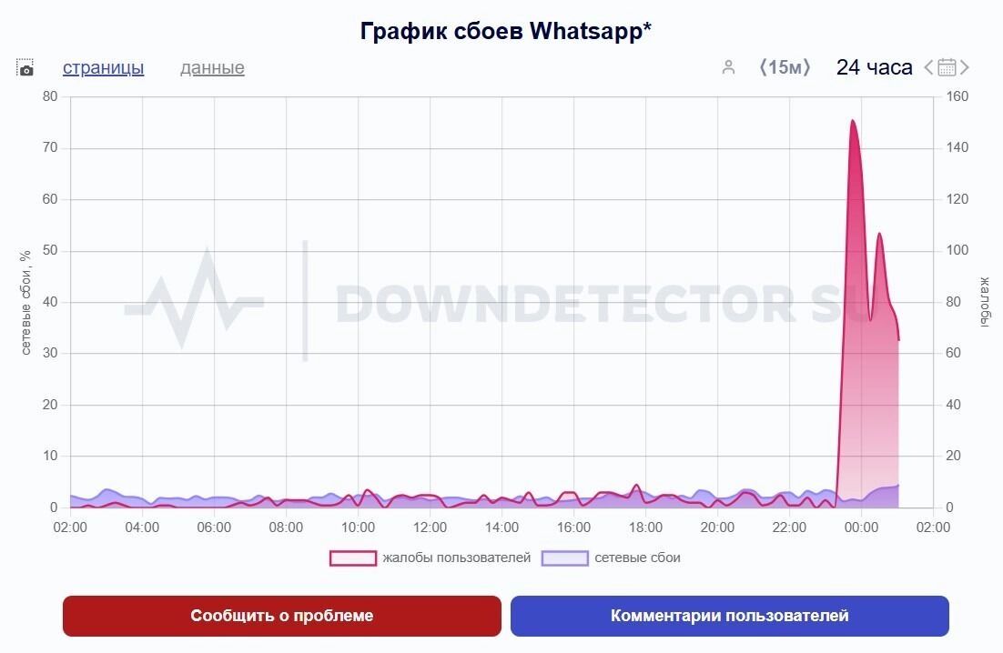 Примерно в это же время у части пользователей перестал работать WhatsApp*. За сутки около тысячи жалоб, за последний час — несколько сотен.