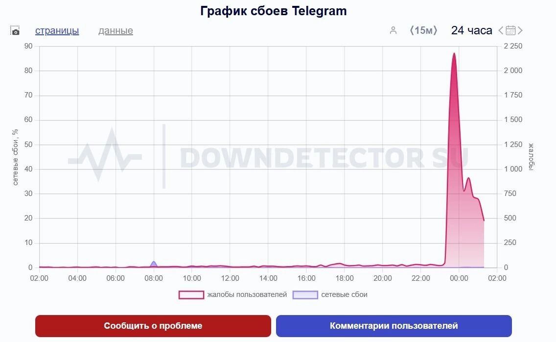 Так, сбои в работе Telegram стали фиксироваться после 23:30 мск. За час поступило более двух тысяч жалоб, и более десяти тысяч — за сутки.