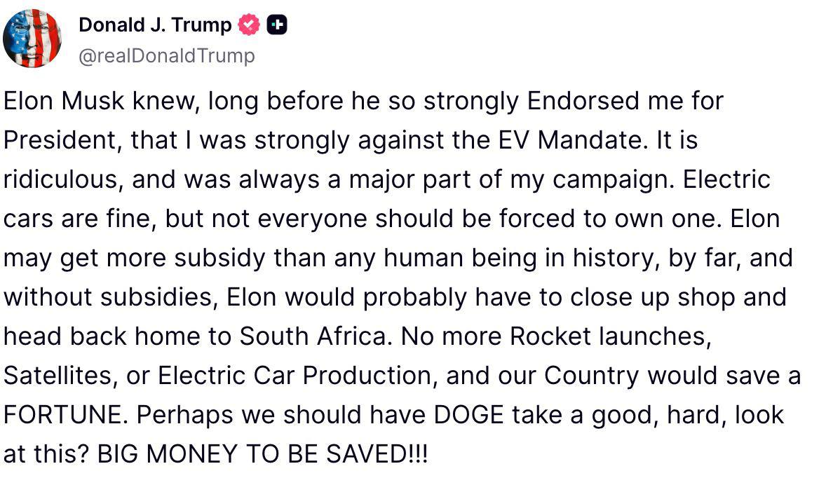 «Илон Маск задолго до того, как он так решительно поддержал мою кандидатуру на пост президента, знал, что я категорически против электромобилей. Это смешно, но это всегда было главной частью моей кампании. Электромобили — это прекрасно, но не всех следует заставлять иметь их. Илон, возможно, получит больше субсидий, чем любой другой человек в истории, и без субсидий ему, вероятно, пришлось бы закрыть магазин и вернуться домой в Южную Африку. Больше никаких запусков ракет, спутников или производства электромобилей, и наша страна сэкономила бы целое состояние. Может быть, нам следовало бы хорошенько, пристально взглянуть на это? БОЛЬШИЕ ДЕНЬГИ, КОТОРЫЕ НУЖНО СЭКОНОМИТЬ!!!»