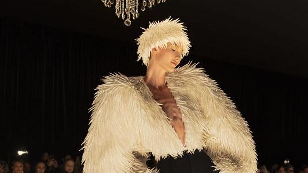 Enfin, un superbe mannequin s'avance très lentement, en regardant l'assistance, et prenant la pose « couture » dans une cape d'oiseau de nuit aux ailes brodées de plumes d'argent, hommage à Elsa Schiaparelli (que Roseberry voit comme un phénix) quand elle rendait elle-même hommage à Anna Pavlova (indissociable de son rôle de La Mort du cygne). Les pièces spectaculaires lui succèdent : bustier en velours à pois et broderie caviar ou en écaille de cuir laqué, fourreau hérissé d'épines, boléro façon plumes, robe drapée descendant en millefeuille d'organza qui ondule comme une vague (rappelant les millefeuilles de la précédente haute couture de Pieter Mulier pour Alaïa), vestes à revers « mètre ruban » très « Schiap », corsets aux seins talons aiguilles très Gaultier…
