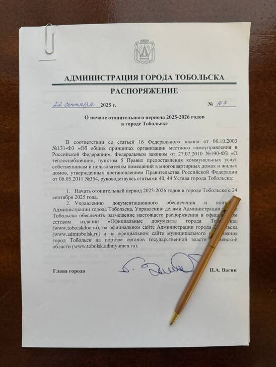 Отопительный сезон в Тобольске стартует с 24 сентября. Соответствующее распоряжение подписал глава города Петр Вагин и опубликовал его в соцсетях сегодня, 23 сентября.