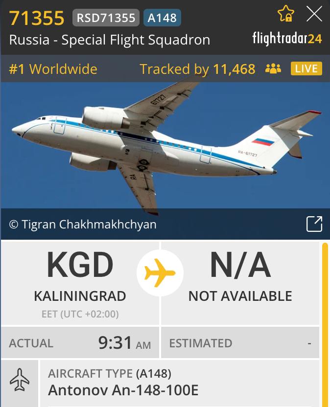 На фоне сообщений об одном из этапов масштабного обмена заключёнными между РФ, Белоруссией, США и Германией в Калининграде замечен самолёт Ан-148. По информации Mash, России выдали Артёма и Анну Дульцевых. Спецборт, который использовали при обмене Виктора Бута, не стал садиться в Москве и полетел в сторону Мурманска.