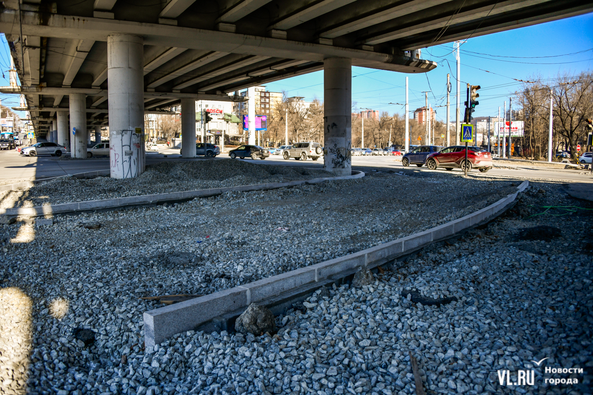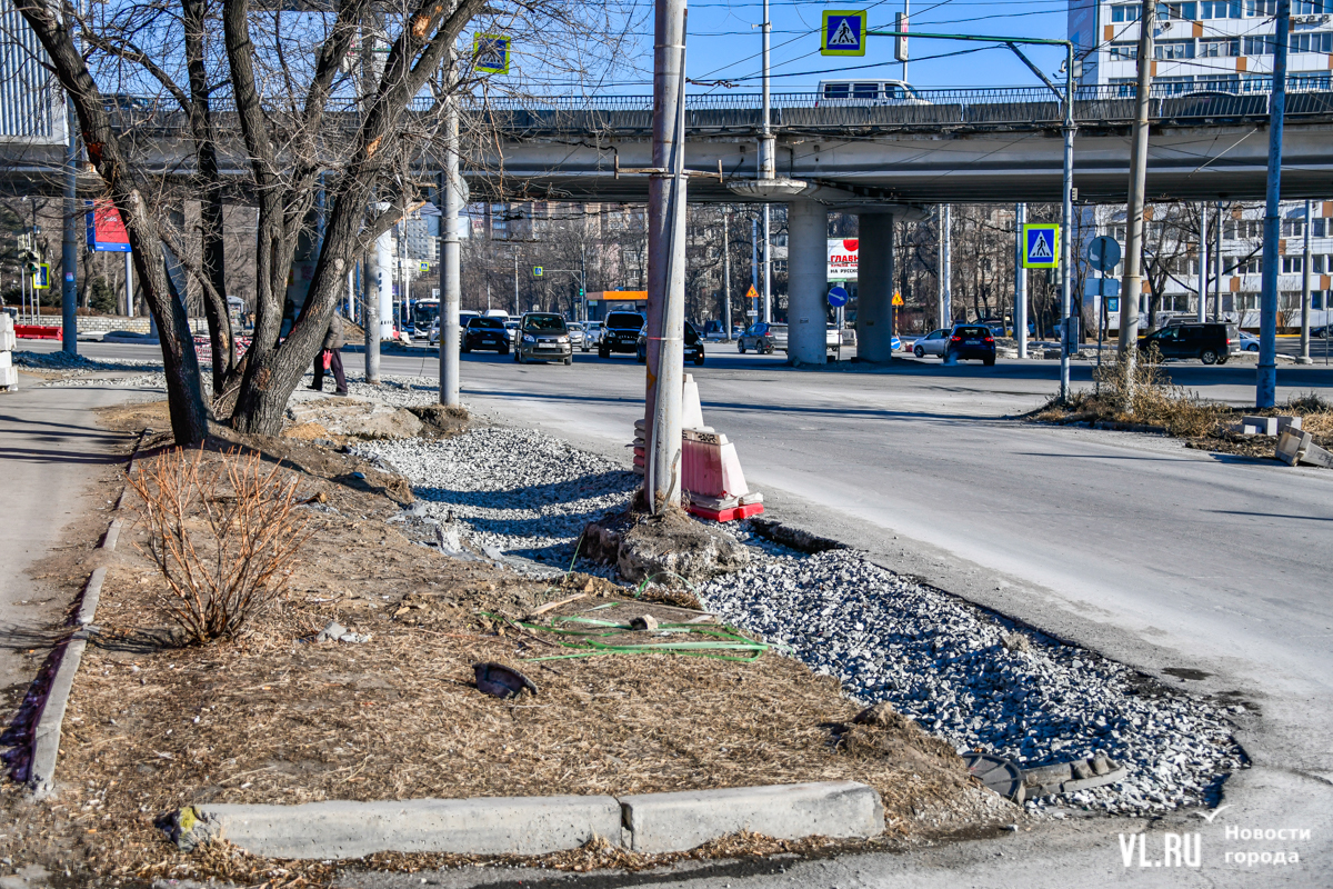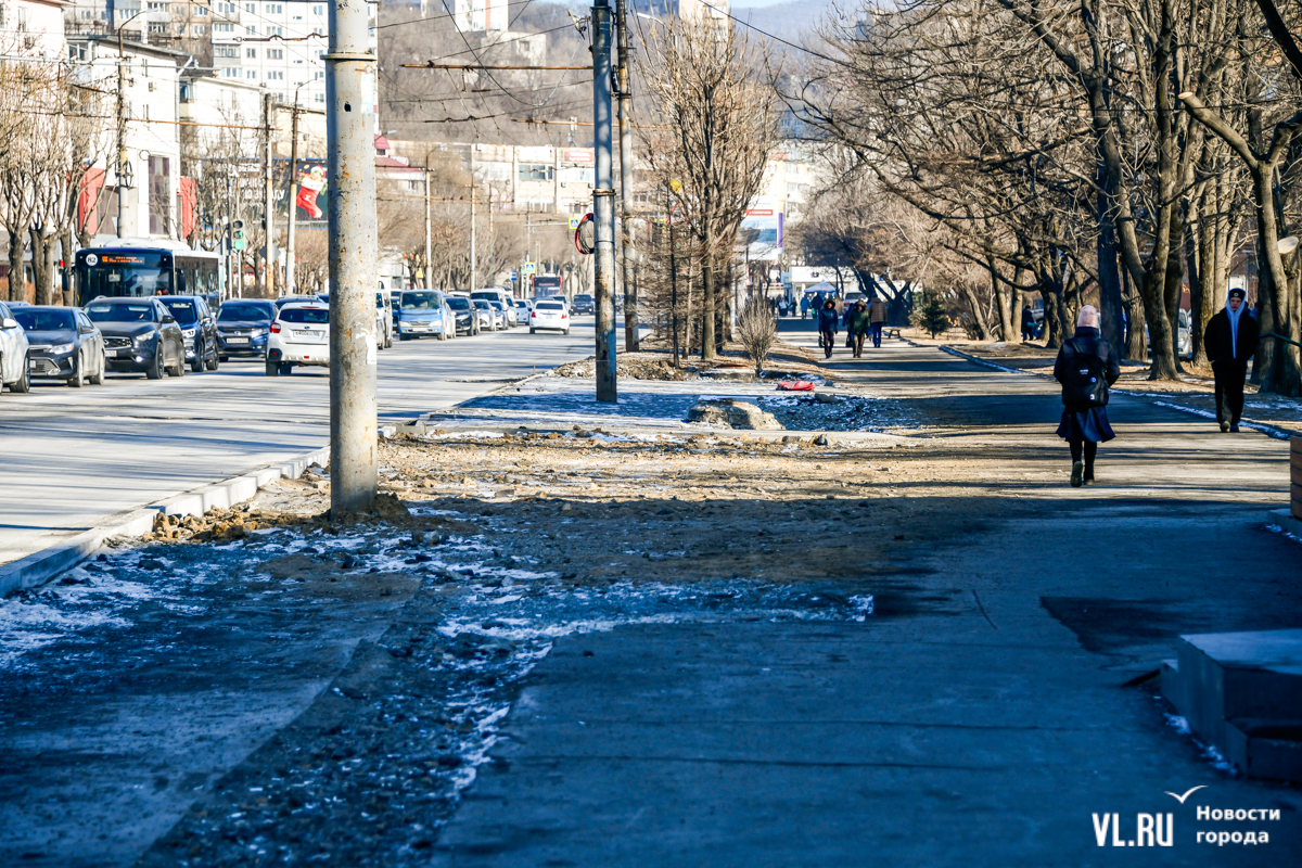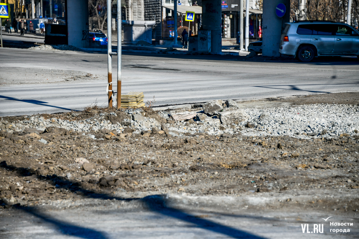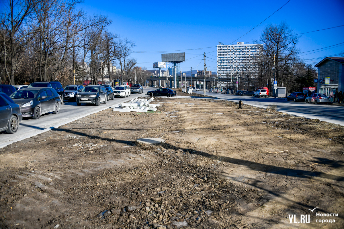 Договор на работы заключили с компанией «РСК», зарегистрированной в Москве. Цена контракта составляла 137,5 млн рублей, сейчас – 144,28 млн рублей. Подрядчику выплатили аванс в размере почти 50% (68,79 млн рублей), что потребовало заключения дополнительного соглашения. Фактически выполнено работ, согласно актам, всего на 22,8 млн рублей. У подрядчика из Москвы было два субподряда из Приморского края, а часть работ в конце прошлого года даже взяло на себя СГТ. Городские службы укладывали бордюры, и это, кажется, единственное, что изменилось там с ноября. Бордюры действительно уложены, хотя не все и не везде.