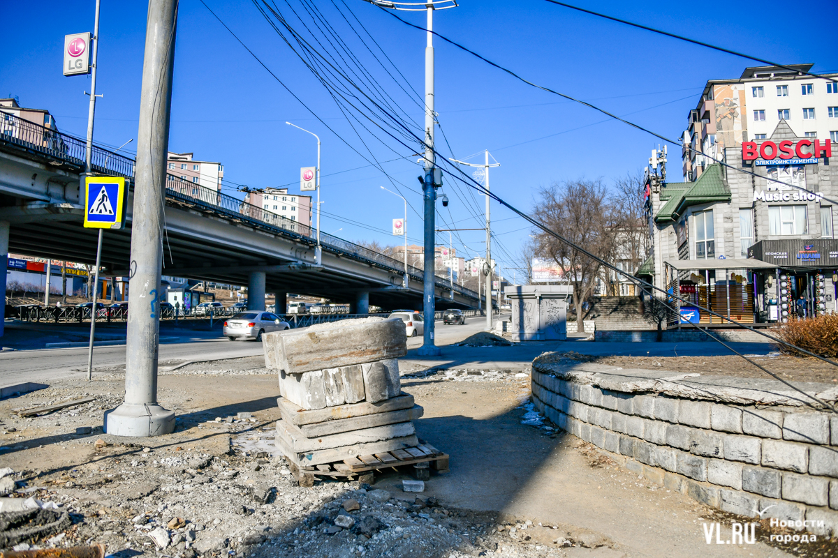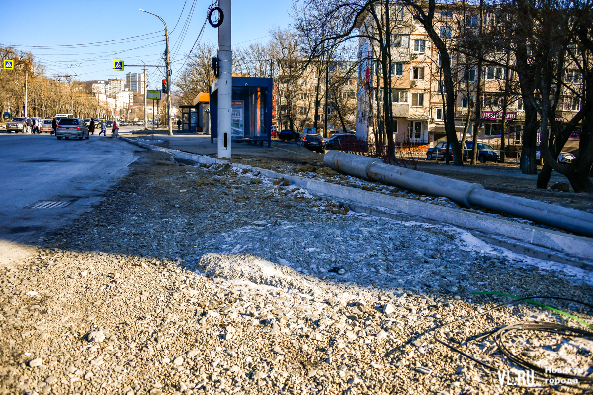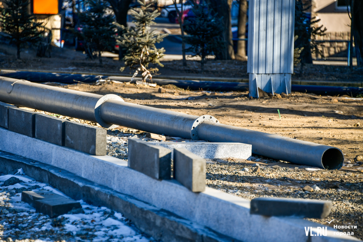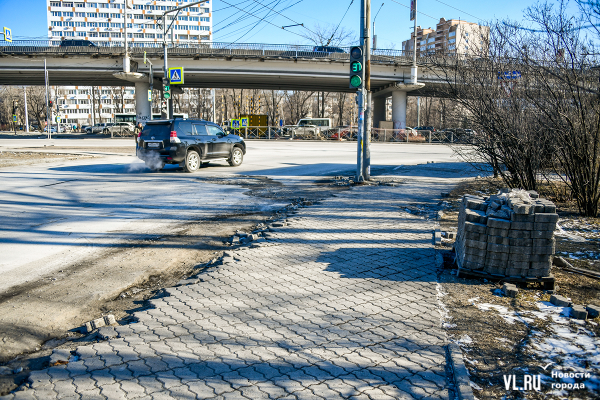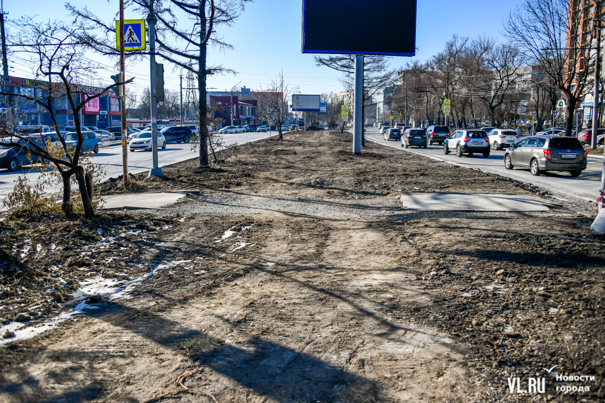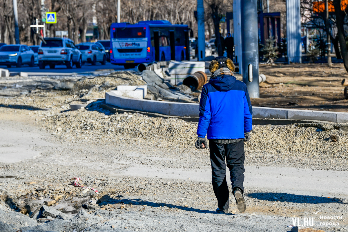 Договор на работы заключили с компанией «РСК», зарегистрированной в Москве. Цена контракта составляла 137,5 млн рублей, сейчас – 144,28 млн рублей. Подрядчику выплатили аванс в размере почти 50% (68,79 млн рублей), что потребовало заключения дополнительного соглашения. Фактически выполнено работ, согласно актам, всего на 22,8 млн рублей. У подрядчика из Москвы было два субподряда из Приморского края, а часть работ в конце прошлого года даже взяло на себя СГТ. Городские службы укладывали бордюры, и это, кажется, единственное, что изменилось там с ноября. Бордюры действительно уложены, хотя не все и не везде.