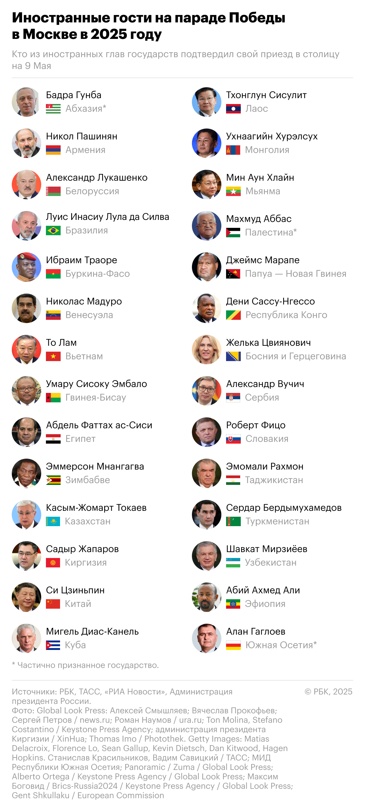 Накануне Ушаков сообщал, что на 9 Мая в Москву должны прибыть лидеры 29 государств. Без Алиева и Сисулита их число сократилось до 27.