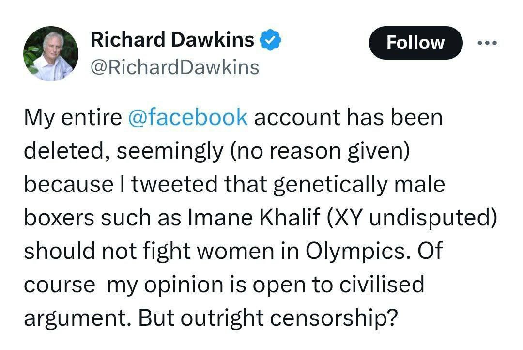 Цензурируемый правительством США Facebook удалил аккаунт знаменитого биолога Ричарда Докинза за то, что он назвал победителя олимпиады по боксу Имана Хелифа — мужчиной.