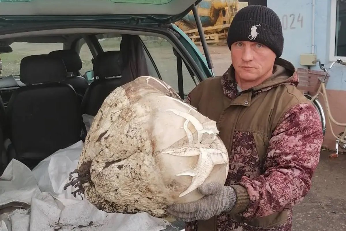 Агроном Иван Аврамчик срезал на поле сельхозпредприятия, расположенного недалеко от агрогородка Ковали, гигантский гриб-дождевик.