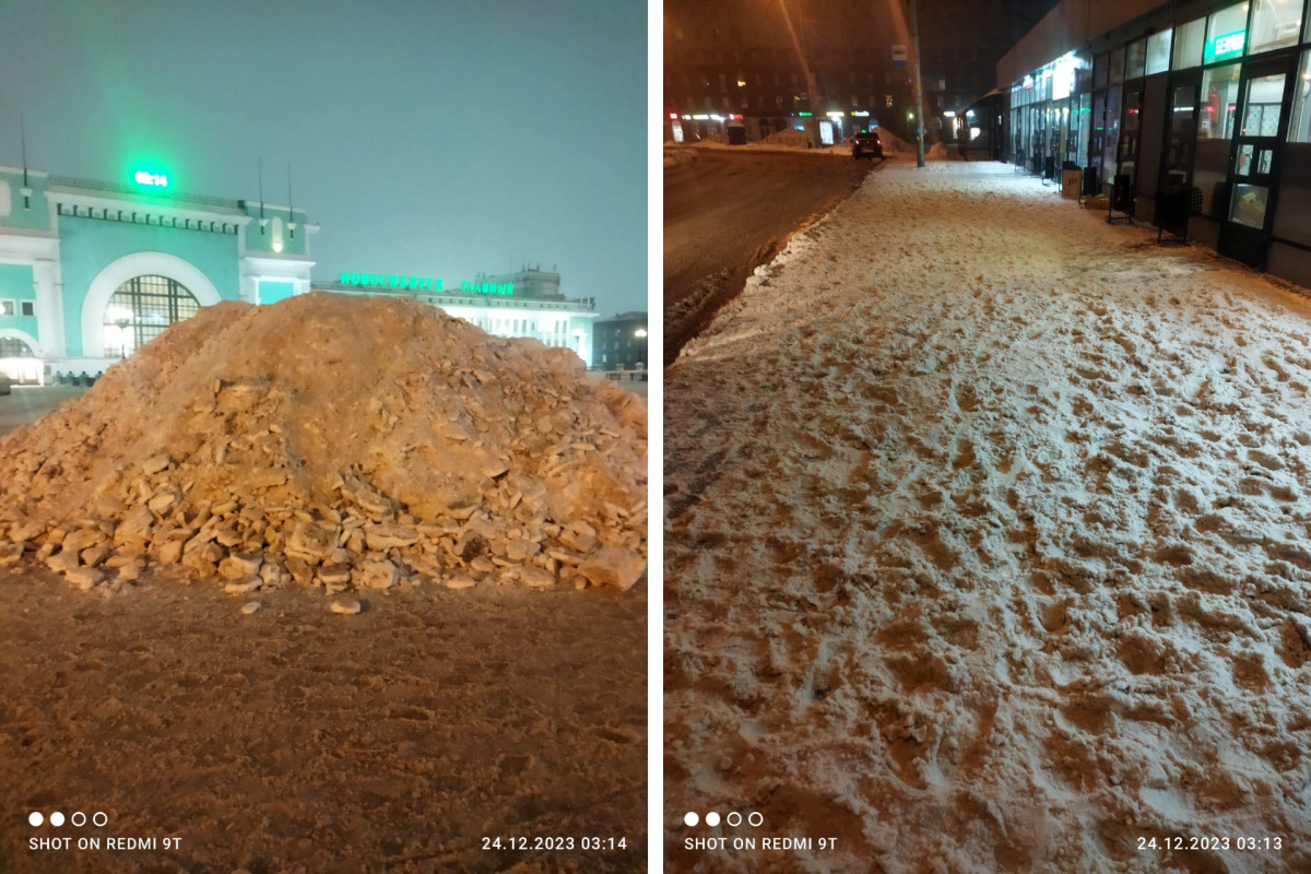 Жительница Новосибирска Наталья возмутилась состоянием тротуара на остановке «Вокзал Новосибирск-Главный». Женщина сняла на видео, как после уборки снега с дороги на тротуаре остались сугробы, а снег на тротуаре похож на кашу.