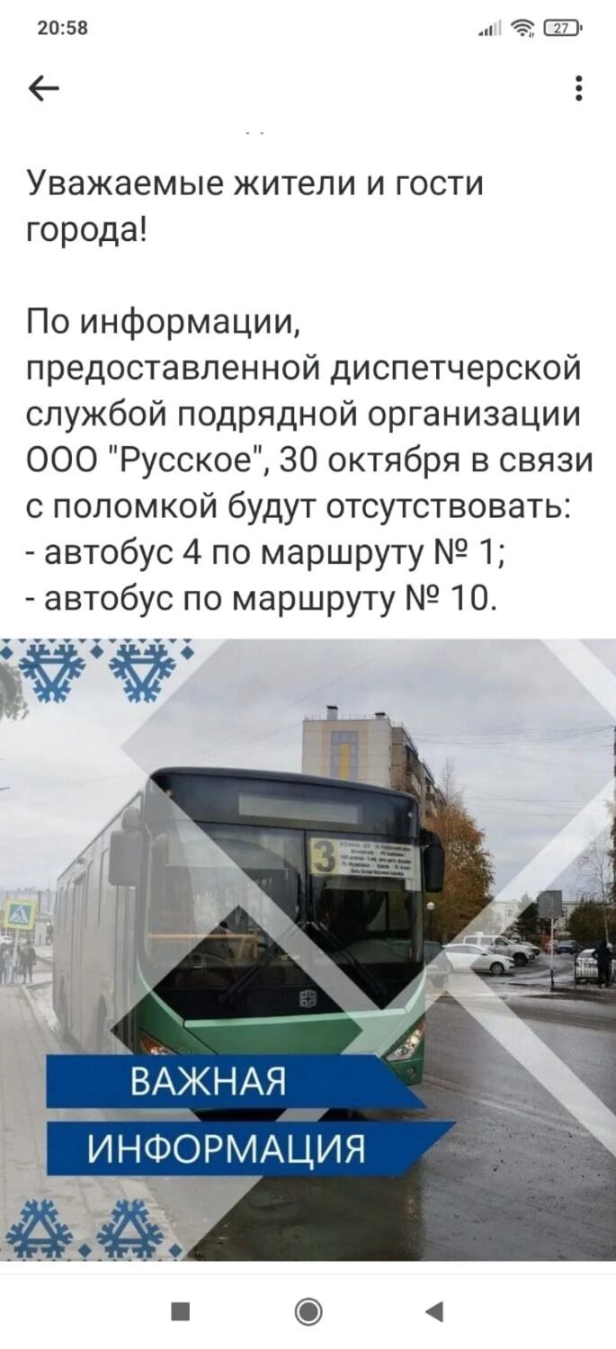 Даже по сообщениям самой администрации города видно, что за октябрь рейсы отменяли регулярно из-за поломок. Например, 30 октября, на линии нет одного из автобусов по маршруту №1 и полностью отсутствует №10.