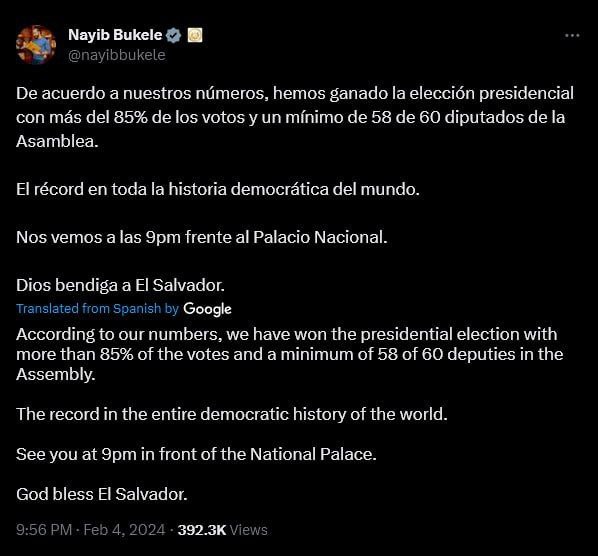 Президент Сальвадора Наиб Букеле поздравил себя с "рекордом за всю историю мировой демократии" и объявил о своём триумфальном переизбранием в X (Twitter).