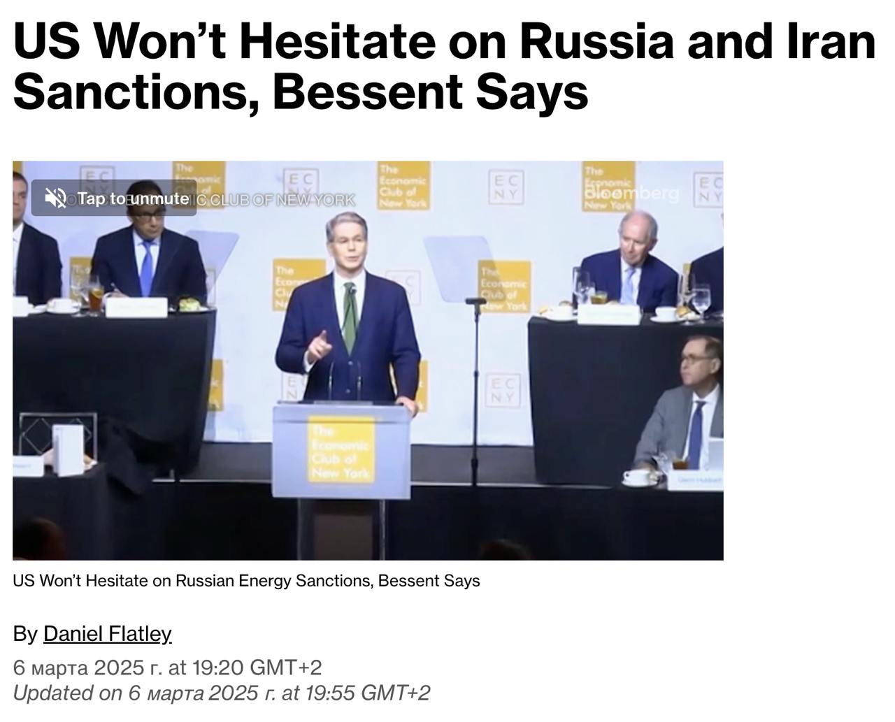 Министр финансов США Скотт Бессент заявил, что Штаты без колебаний введут «полный» пакет санкций против российских энергоносителей, если это поможет добиться прекращения огня, пишет Bloomberg.